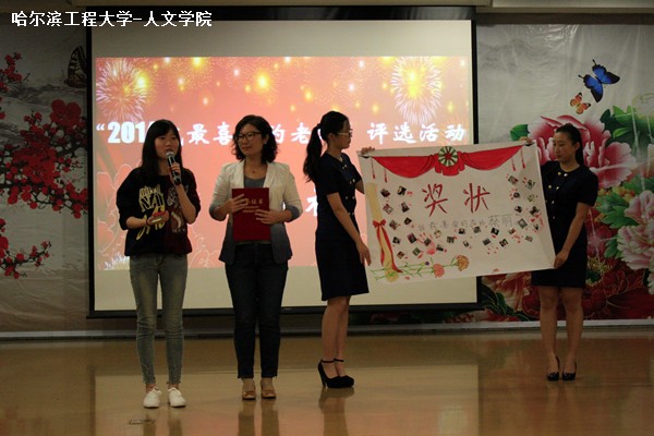 此次颁奖环节由四个部分组成。首先,通过大屏幕播放蔡丽的视频。视频由人文学院学生录制,其中包括蔡老师的寄语和日常教学片段等内容。主持人朗读颁奖词后,人文学院13级应用心理学班的学生代表关依琳为蔡丽颁发奖品。奖品是由该班全体同学共同制作的奖状,上面贴有全班30位学生的生活照并盖以手印,象征该班师生间如大家庭一般的亲密关系。颁奖过后,蔡老师在学生代表的邀请下在奖状上盖手印。最后,蔡老师为所有师生献上祝福:“幸福是积极、快乐、有意义地生活,愿所有人都能找到属于自己的幸福生活。”