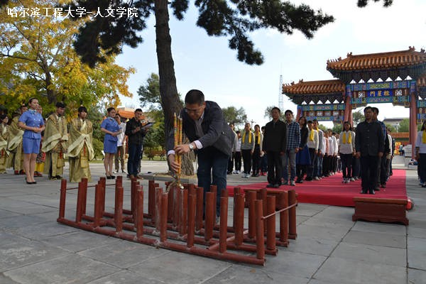 祭孔典礼正式开始前,人文学院领导、教师及学生共同完成“启户”环节,列队整齐经过状元桥、棂星门,进入祭孔典礼场地。过后,杨国庆为祭孔典礼致辞,领导、教师向孔子行礼后,刘军作为教师代表向孔子敬香。