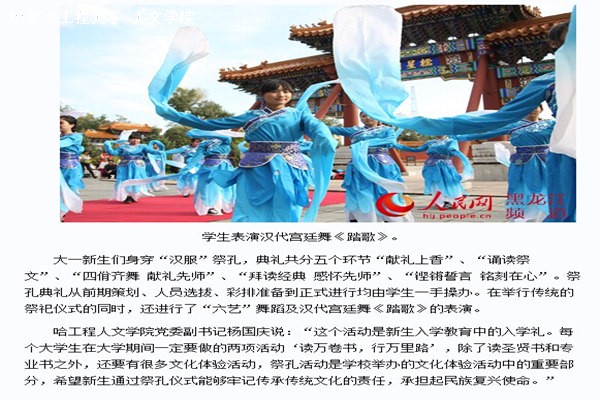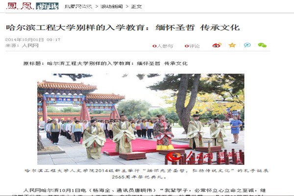 2013年9月30日,人民网、新华网30多家媒体发布新闻对人文学院学生赴孔庙行祭礼仪活动进行了全面介绍。
