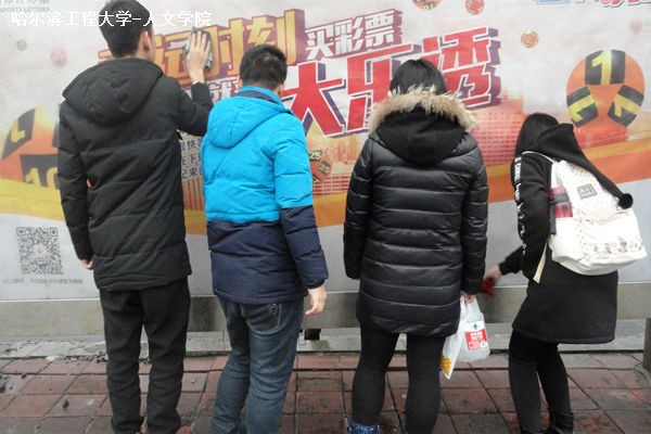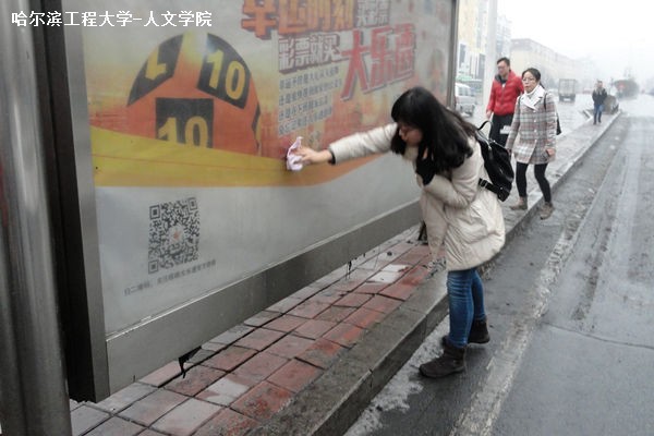 到达预定地点后,刁润婷、吴文霞首先提出本次实践活动的目的为清理车站牌,净化公共环境。然后,全体成员对需要清理的范围进行划分,具体工作任务包括工具准备、清理等。每位成员根据自己的任务选择合适的工具,对站牌上不同区域的小广告进行清理。清理过程中,全体成员互相帮助、配合默契,工作积极性并未受到下雪和结冰等客观因素影响。最后,同学们顺利将小广告清理干净,并合影留念。
