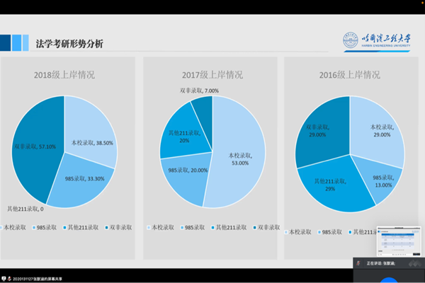 团委书记刘文璟指出,近些年来,国内的考研人数猛增、竞争激烈,而国内高校对法学研究生的录取比例却没有等比上涨,研究生考试的难度堪比高考。面对如此严峻的考研形势,今年上岸的各位同学,他们之中有人在一年内考研成功并通过了法考,有人跨专业考研进入梦想院校,我们可以在他们身上看见考研的N种选择。希望同学们能够通过这次经验分享会认识到研究生考试的趋向,并学习到几位学生代表的成功经验,为考研做好准备工作。