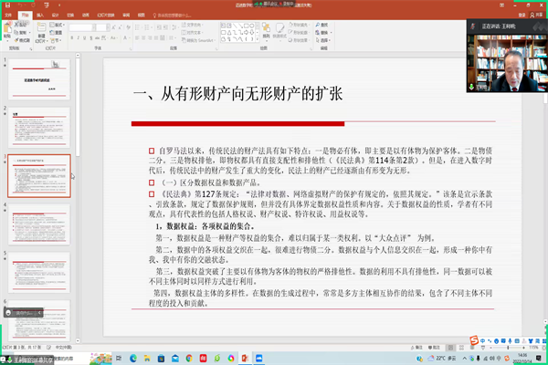 讲座开始,王利明教授从新冠肺炎疫情、传统业务流程及业务模式存在的不足、数字化时代下的法律问题等一系列方面指出民法迈进数字时代面临的挑战。随后,他通过从有形财产向无形财产的扩张、从注重财产权益向注重人格权益发展、从注重归属到注重利用的转化、从有形财产保护到无形财产保护的转变、从意思自治到维护人格尊严的发展五个方面对迈向数字时代的民法如何回应这些困难进行详细分析。最后,王利明教授强调数字与法治要同步发展,民事立法要在回应数字时代的需求中不断发展完善。