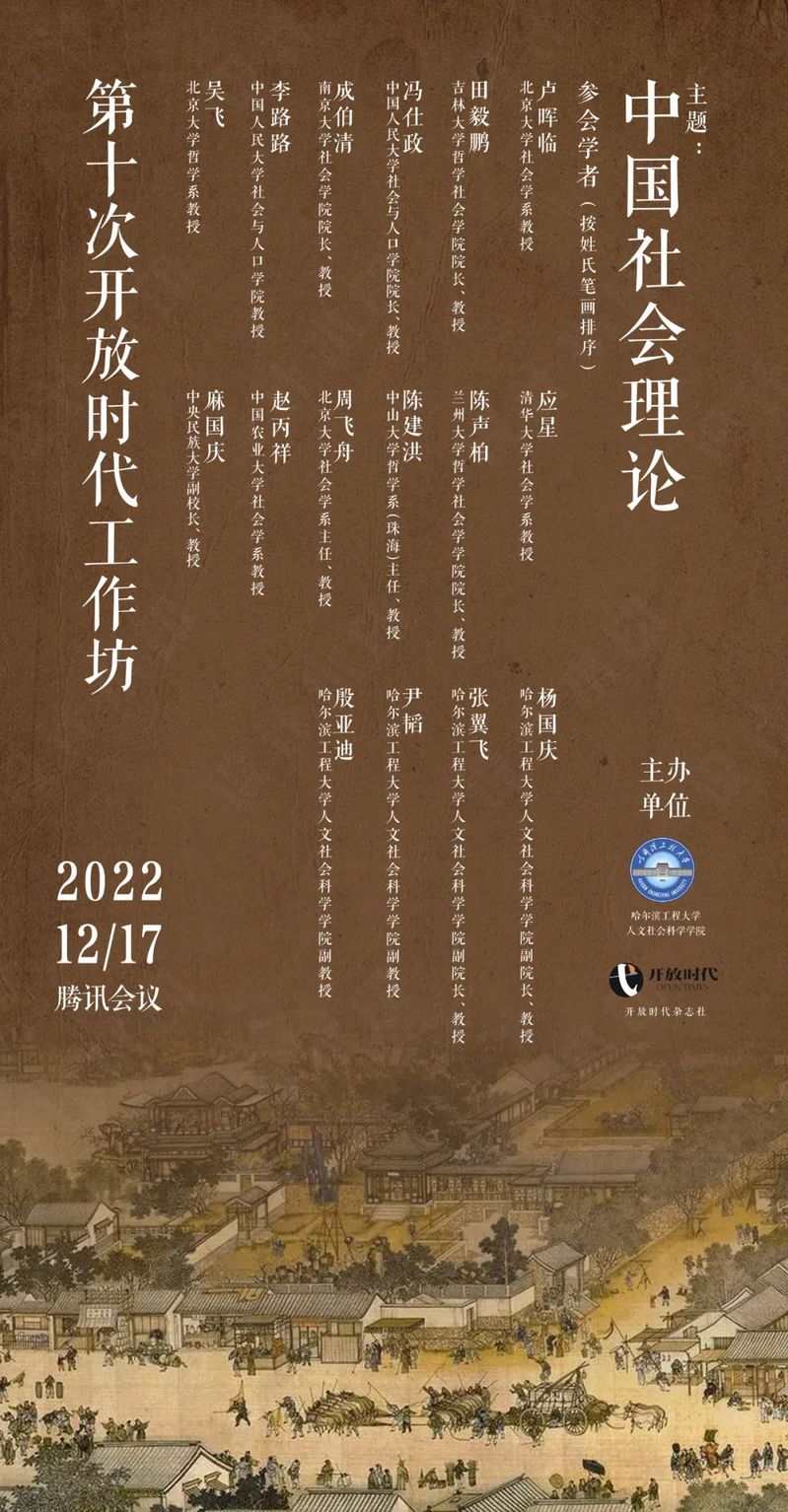 2022年12月17日,由开放时代杂志社、ac米兰官网中文网站共同举办的第十次开放时代工作坊通过腾讯线上会议方式举行,来自北京大学、清华大学、中国人民大学、中央民族大学、南京大学、吉林大学、兰州大学、中山大学、中国农业大学、ac米兰官网中文网站的16位专家学者参会发言。此次工作坊的主题是“中国社会理论”。
