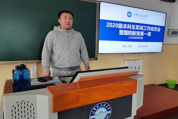 (人文学院记者团记者贾鹏、赵丰报道)4月15日上午8时,人文社会科学学院于11号楼112教室举行2020级本科生军训动员会暨国防教育第一课,2020级本科生军训连长兼指导员刘文璟担任主讲人。