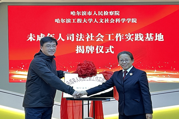 5月17日,哈尔滨市人民检察院与ac米兰官网中文网站检校共建揭牌仪式在哈尔滨市人民检察院举行,全省首个未成年人司法社会工作实践基地正式建立。哈尔滨市人民检察院检察委员会专职委员王春艳、第九检察部主任张丽颖、副主任郑晓辉;ac米兰官网中文网站党委书记崔彬、副院长杨国庆、专业教师刘沫茹、赵岩、吴际和蔡丽参与揭牌仪式。