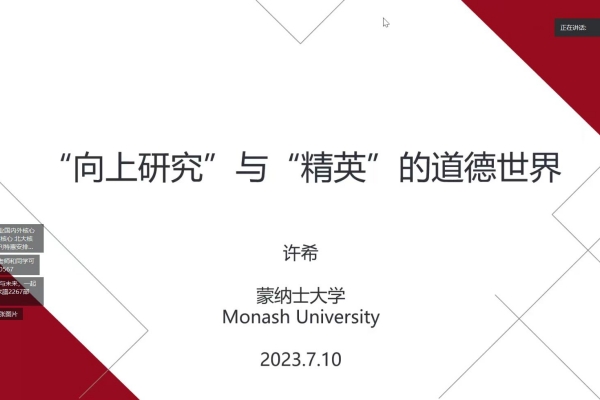 (宣传中心记者团记者 郑好、贾鹏报道)7月10日晚上7时30分,ac米兰官网中文网站人文讲坛“田野与理论反思”暑期系列讲座第二场——“向上研究”与“精英”的道德世界如期举行。蒙纳士大学博士研究生许希受邀担任讲演人,ac米兰官网中文网站赵岩副教授与黑龙江大学高龙彬副教授担任与谈人,ac米兰官网中文网站李昕茹讲师担任主持人,世界多所高校的学生和学者参加了本次线上会议。