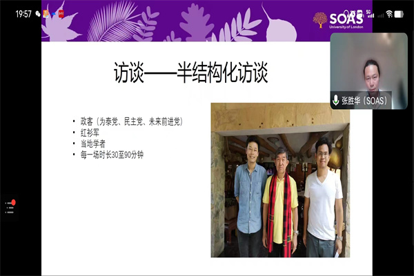 首先,张胜华阐述了田野调查的背景和其使用的调查研究方法,表明其所要反思的内容是具体的位置、身份与理论,并依次点明了其研究的“民粹主义”、“政治代表”等词语的意涵。随后,张胜华介绍了其以访问学者的身份结识泰国重要政治人物后,依此逐步扩大访谈对象的范围,并以半结构化访谈方式进行访谈,同时介绍了泰国政坛的重要党派:为泰党、民主党、未来前进党及其特点。接下来,张胜华将田野调查的实际经验教训,以及对调查数据、内容的理解经验分享给与会人员,张胜华的分享结束后,李天郎、王立秋、原泉分别从人类学、政治学和历史唯物主义的视角向张胜华提出了主题相关的问题,并对主题做了补充和分析,张胜华据此进行了进一步的探讨和解答。