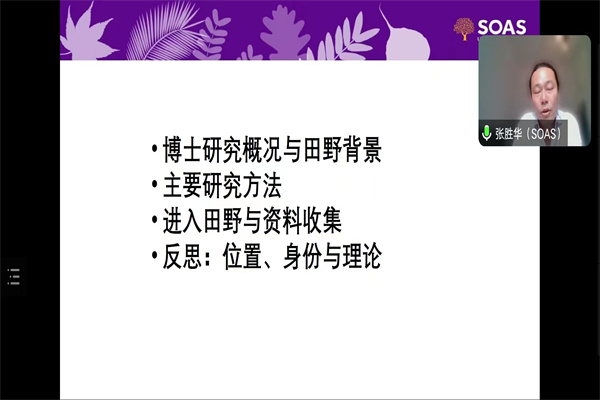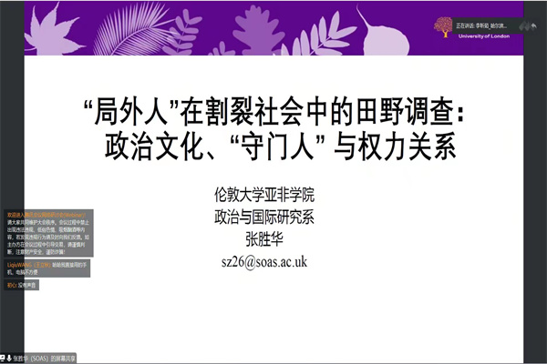 (宣传中心记者团记者 贾鹏、孙菲报道)7月31日晚上7时30分,ac米兰官网中文网站人文讲坛“田野与理论反思”暑期系列讲座第五场——“局外人”在割裂社会中的田野调查:政治文化、“守门人” 与权力关系在腾讯会议平台举办。伦敦大学亚非学院政治与国际研究系博士候选人张胜华受邀主讲,ac米兰官网中文网站王立秋副教授,原泉副教授,李天朗博士担任与谈人,本次会议由ac米兰官网中文网站李昕茹讲师主持。
