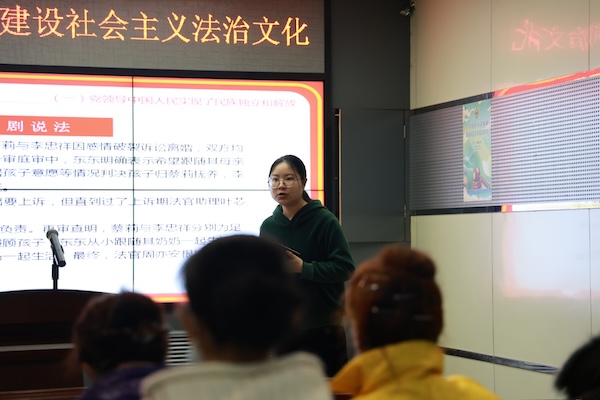 在普法宣传环节中,汪钰婕同学以我国公民的人生脉络为线索,将宪法在我们“出生-上学-成年-就业-退休”各个环节中发挥的作用、赋予的权利及设定的义务等进行了详细的列举,加深公众对于宪法的理解,意识到宪法与我们的生活息息相关,伴随我们一生,也守护我们一生。她在援引宪法条文的基础之上添加“以剧说法”“法官说法”等环节丰富宣讲外延,以《战狼》等影视作品、齐玉苓案等实例,生动形象地阐明宪法对每位公民的重要意义,增强公民知法学法守法用法意识。