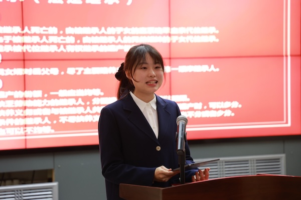 接下来,易小语同学概括介绍:《中华人民共和国民法典》被称为“社会生活的百科全书”,是新中国第一部以法典命名的法律,在法律体系中居于基础性地位,也是市场经济的基本法。《中华人民共和国民法典》共7编、1260条,各编依次为总则、物权、合同、人格权、婚姻家庭、继承、侵权责任,以及附则。她从“一般规定”“法定继承”“遗嘱继承和遗赠”“遗产的处理”四个方面展开,就民法典继承编的条款进行细致解读。