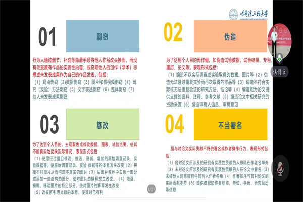 首先,侯博文介绍了学术诚信的含义、表现,以及倡导学术诚信的原因;接下来从科研诚信、论文诚信、考试诚信、学术规范几方面展开,介绍了学术诚信在不同领域的具体表现和要求;随后普及了关于学术不端行为类型界定的相关知识以及对应的相关文件和高校制度;最后讲述了学术不端导致严重后果的经典案例,警醒与会人员。
