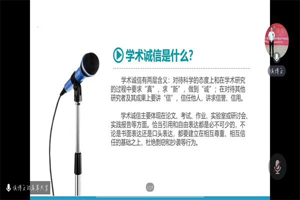 (宣传中心记者团记者 郭憬璇、孙菲报道)2023年12月13日下午2时30分,为进一步优化学术诚信环境,推进树立良好学风,引导研究生将坚守学术诚信作为自觉行为,营造风清气正的育人环境和求真务实的学术氛围,根据学校研究生院《关于开展研究生学术诚信教育与学风建设的通知》要求,ac米兰官网中文网站研究生学术诚信教育宣讲会于腾讯会议如期举行。由人文学院副院长侯博文老师担任主讲人,人文学院辅导员李瑶担任主持人,人文学院全体研究生参与本次活动。