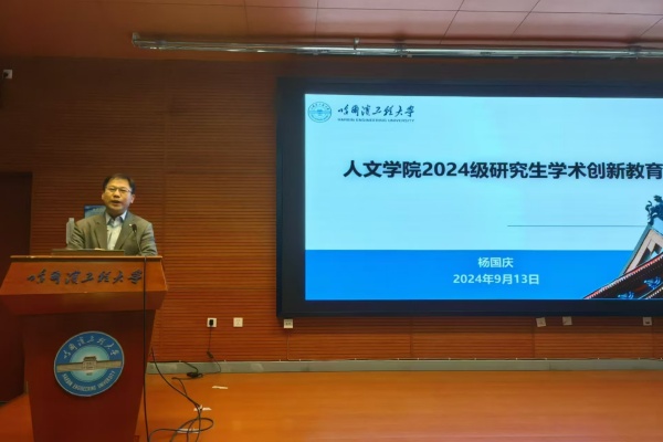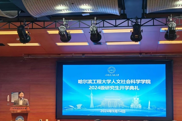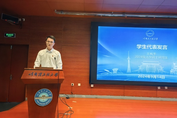 随后,学生代表2024级法学硕士王枫予进行发言。他讲到,在新起点新征程上,我们应当以昂扬的奋进姿态,迎接未来的研究生生活。我们不仅期待学术知识的沐浴洗礼,也盼望着挑战的到来。在老师的悉心指导下,完成学业以及科研任务,更要肩负起传递知识、弘扬人文精神的重要使命。我们应当以怀抱梦想、脚踏实地的情怀传承哈军工的精神。