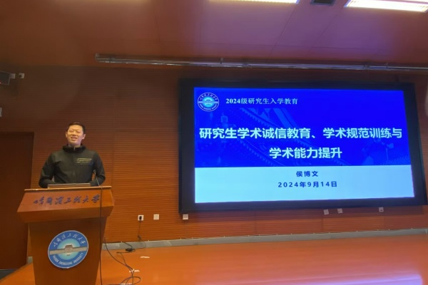 之后,学院副院长侯博文开展学术诚信教育。他以大学之大不在于大楼,而在于大师为主题,向同学们讲述了学术诚信的重要性。他指出,学术研究是一件严肃的事情,同学们应当认真对待。学校为大家提供了丰富的网络资源和宝贵的信息库,这为学术研究提供了极为便利的条件,而以诚信的态度进行学术研究也是必不可少的,这既是道德的要求,也是法律的规范。随后,2024级全体研究生现场共同签署了《研究生学术诚信承诺书》。