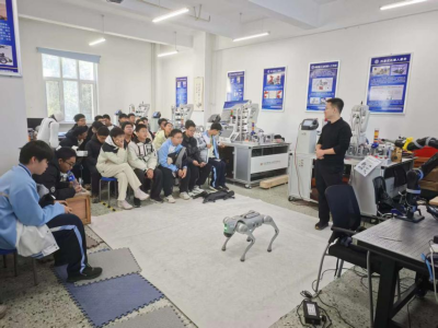 在智能科学与工程学院机器人工程实验室,马英凯博士向同学们展示了实验室自主研发的服务机器人与实验室学生自主编程的机器狗,引来同学们阵阵惊叹。在与机器人设备的互动中,同学们不仅感受到科技魅力,也对未来具身智能领域的发展方向有了更直观的认识。